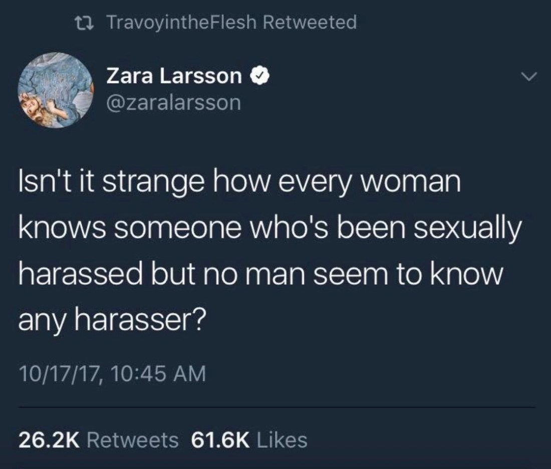 In conversation the other day my mom stopped and asked my dad about what percentage of women he thought had experienced sexual harassment. He said about 20-30% maybe. My mom told him that both of us had been harassed multiple times at work (same goes for both of her sisters) and that she had actually been assaulted by a groper on a public bus. I have never seen anyone’s face go slack so quickly before as he realized that literally every woman in his family had experienced this. And while I’m glad he believed us and has changed his view on that subject I still can’t shake the frustration, the anger, that it required being sat down and spoonfed these incidents that we didn’t particularly wanted to relive. This is something that women have been saying for years, but men just never listen. Not even when they’re forced to sit in mandatory harassment in the workplace training seminars.