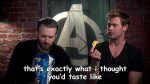 My fav part is that you’ve got Evans going on this face journey of delighted gutter thoughts, and then there’s Hemsworth, just nomming away nonchalantly like he hasn’t just made his buddy plunge suddenly and unexpectedly into nsfw mental image land