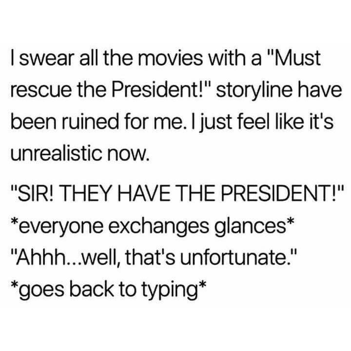 See, I never understood those movies. Like, I thought the entire point of the US president was so you had an elected person–a regular American who is replaceable (and for whom you even have a spare)–instead of a monarch with a divine right to rule. So seriously: