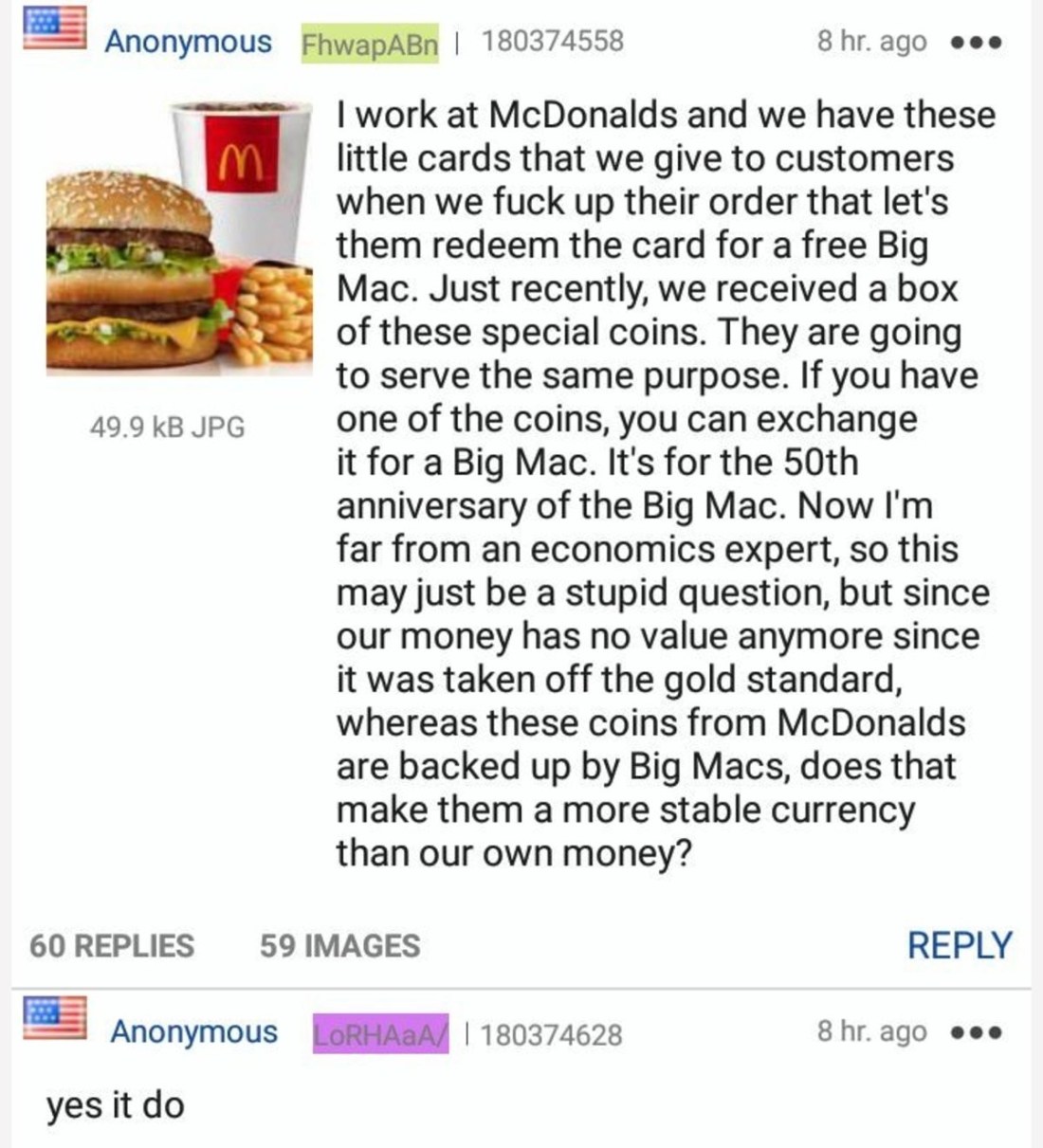 It used to be that paper currency was backed by gold and silver for its value. A 10$ paper note would be redeemable for 10$ worth of gold or silver following the gold or silver standard. Currently our bills are fiat money which means they are not backed by any tangible item. They’re just based on the strength of the economy. The economy can fluctuate so it makes the actual value of a bill unstable. These Mcdonalds coins, however, would be a currency that are redeemable for a Big Mac. This would make them a technically more stable currency as they are always have the value of a Big Mac they can be redeemed for.