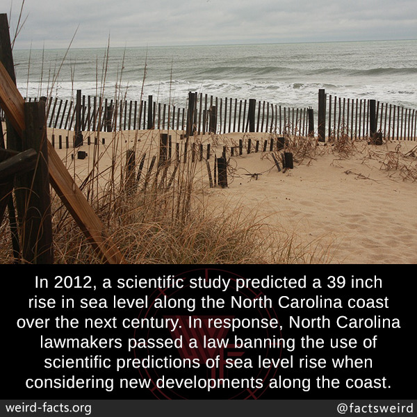 In 2012, a scientific study predicted a 39 inch rise in sea level along the North Carolina coast over the next century. In response, North Carolina lawmakers passed a law banning the use of scientific predictions of sea level rise when considering new developments along the coast.