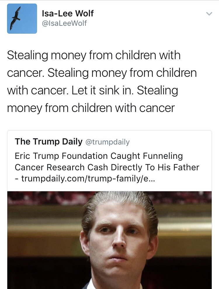 http://abcnews.go.com/US/wireStory/ap-eric-trump-foundation-flouts-charity-standards-44361388Remember when you thought cartoon villains were unrealistic
