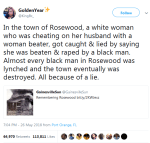 As the above tweets say, Rosewood was a predominately Black town that was destroyed over a weeklong period in January of 1923, after a white woman falsely accused a Black man of rape. There’s a fairly comprehensive article about the town and its history on Wikipedia here. Here’s a link to the Rosewood page on BlackPast.org, as well.