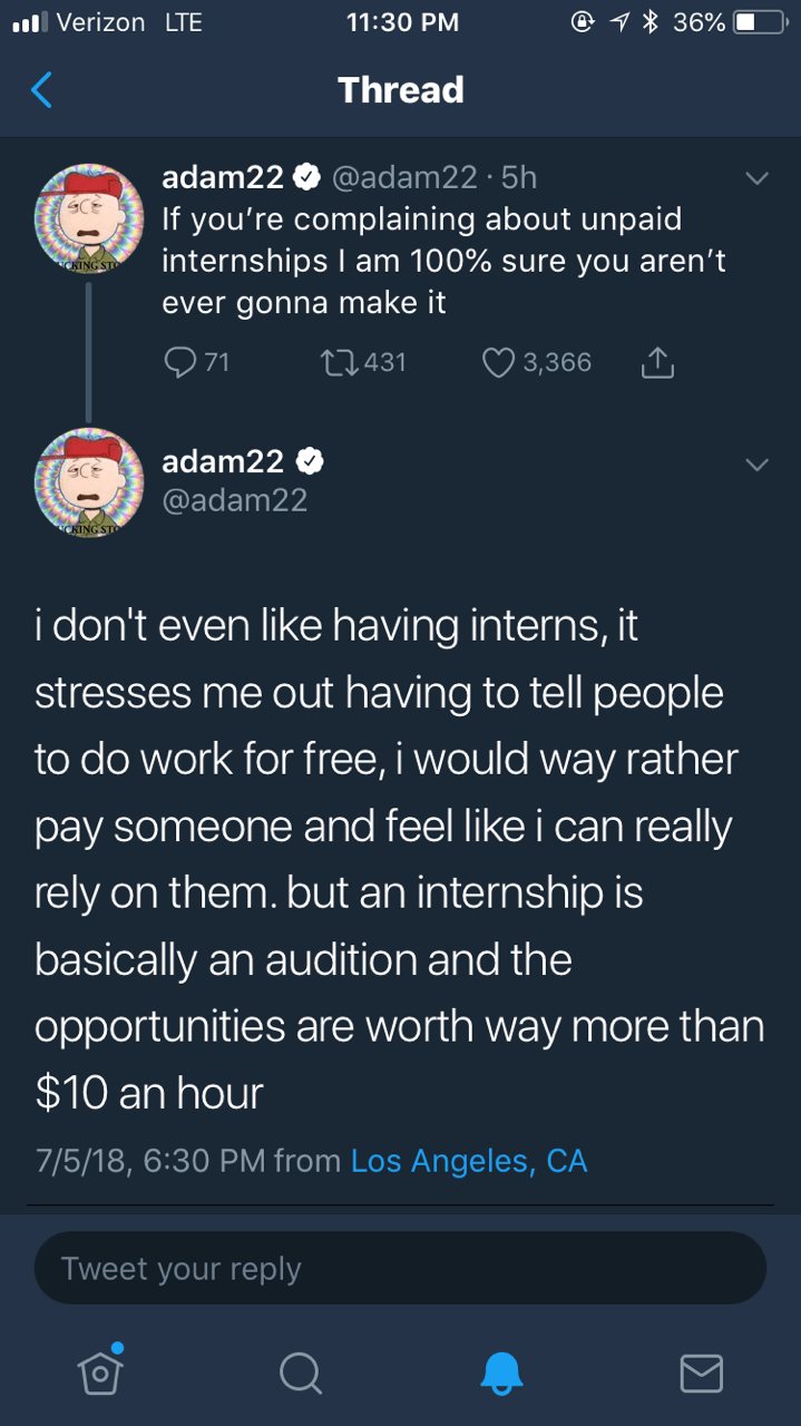 yeah Adam Ruins Everything did a great episode that included why the majority of unpaid internships are actually illegal, so fuck this guy (who apparently is also a rapist??) it boils down to if an unpaid internship doesnt meet any of the below criteria, its illegal: