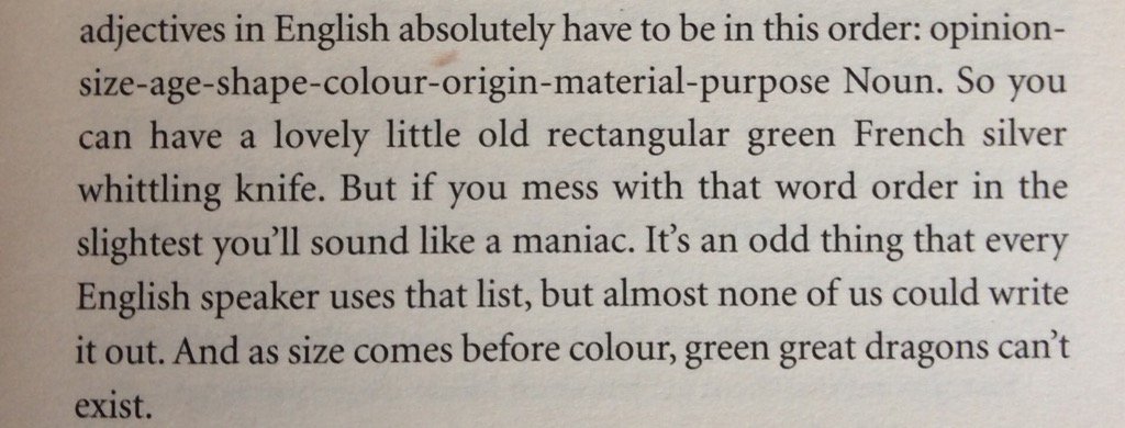 That is profound. I noticed this by accident when asked about adjectives by a Japanese student. She translated something from Japanese like “Brown big cat” and I corrected her. When she asked me why, I bluescreened.