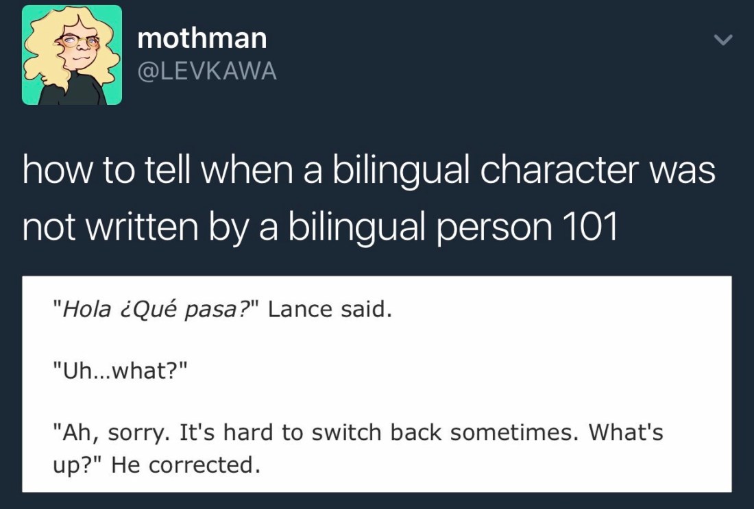 Bilingual characters are great but if you’re going to use a linguistic blunder, you have to really understand what they actually blunder over. And it’s usually 10x funnier than “Ooops it’s hard to switch back.”