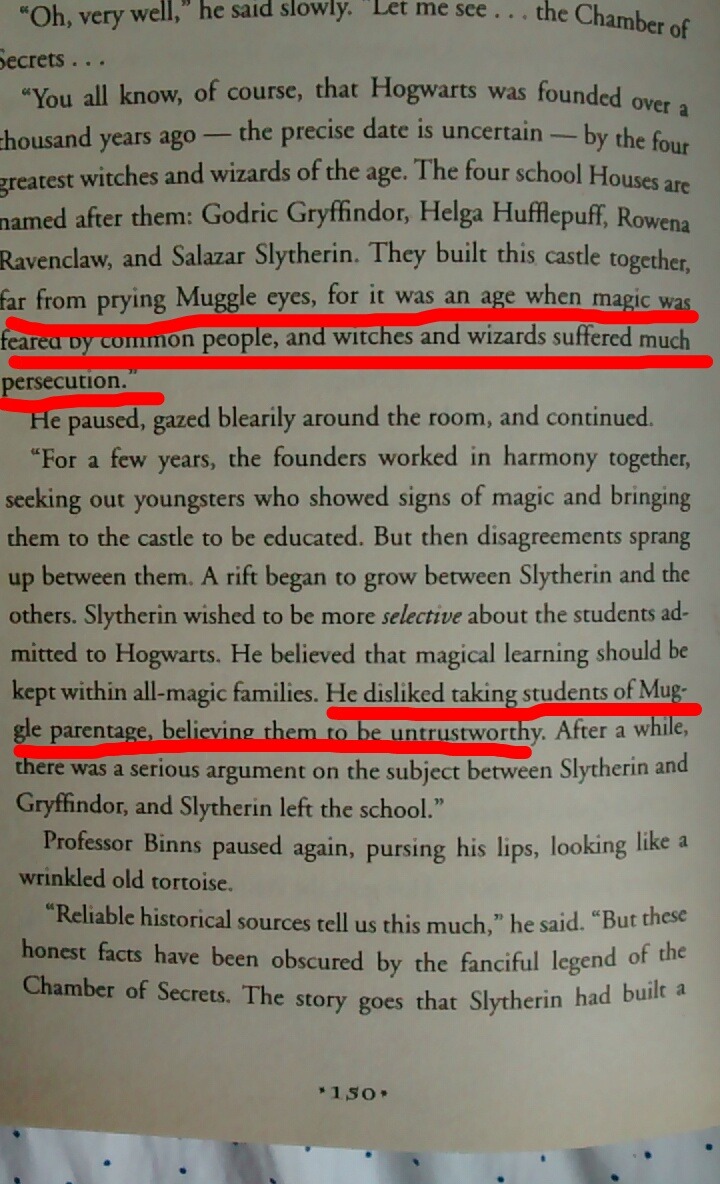 Imagine that Slytherin was afraid of a scenario where Hogwarts was betrayed by some (not all) muggleborns—or by their muggle relatives. Say you’re a 10th century muggle & you find out your child is a witch–how supportive are you likely to be? Keep in mind we’ve already seen how quick, even now, 1,000 years later, too many families are to betray and even kill their own kids for not being ‘normal’ (think of lgbtqa+ youth, for instance). And in this scenario, these muggles were a danger not only to their muggleborn kids, but to the entire Hogwarts community. What was to stop a bigoted relative of a muggleborn from gathering up an angry mob and invading the castle, beauty and the beast style?