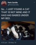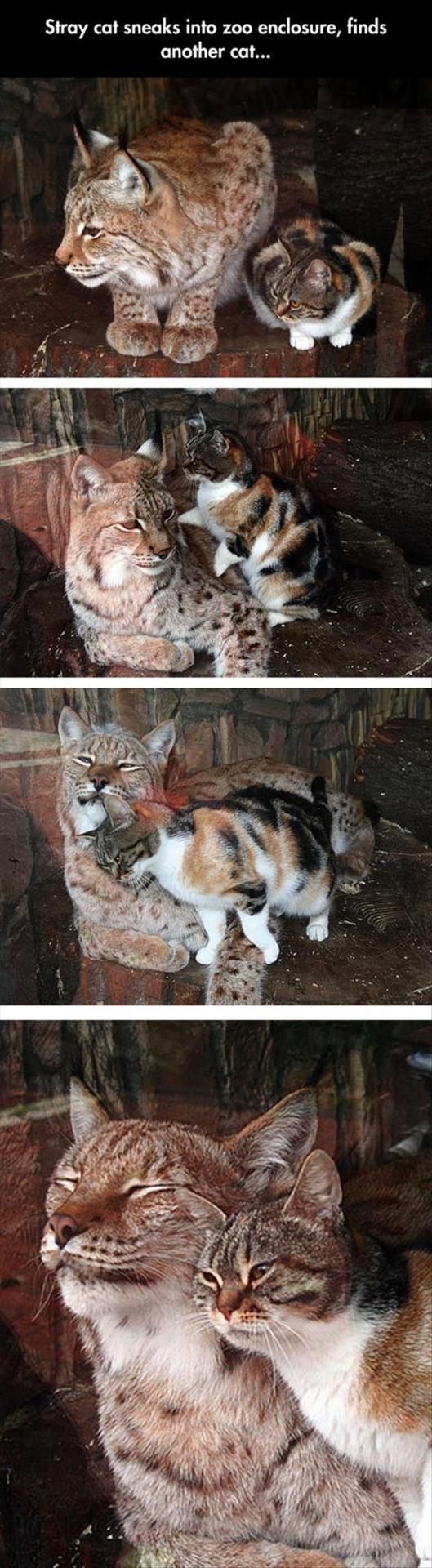 so this stray cat, she obviously has no colony if she’s wandering around and sneaking into zoo enclosures, so she’s like ‘hey! there’s food here! what up, other cat, let’s be friends, let’s be friends and share that food’. and the bobcat is like ‘??????’ because actually wild cats are pretty cautious about initiating hostilities and anything new and aggressive makes them very worried. and the domestic cat is like ‘haha cool, ok, we’re friends now, big guy. no problems.’ and the bobcat is like ‘????? well…?? ok?’ and then they are friends.