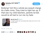 Not to downplay the psychological effect of bullying, but bullying is like…not letting someone sit with you at lunch, or saying their clothes are ugly.
